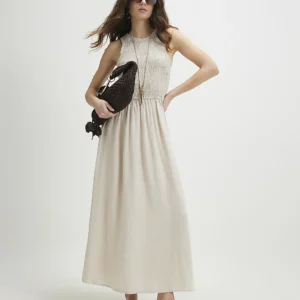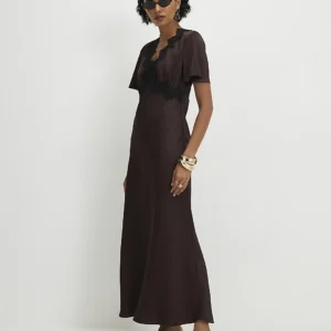 Brown Lace Satin Short Sleeve Slip Maxi Dress