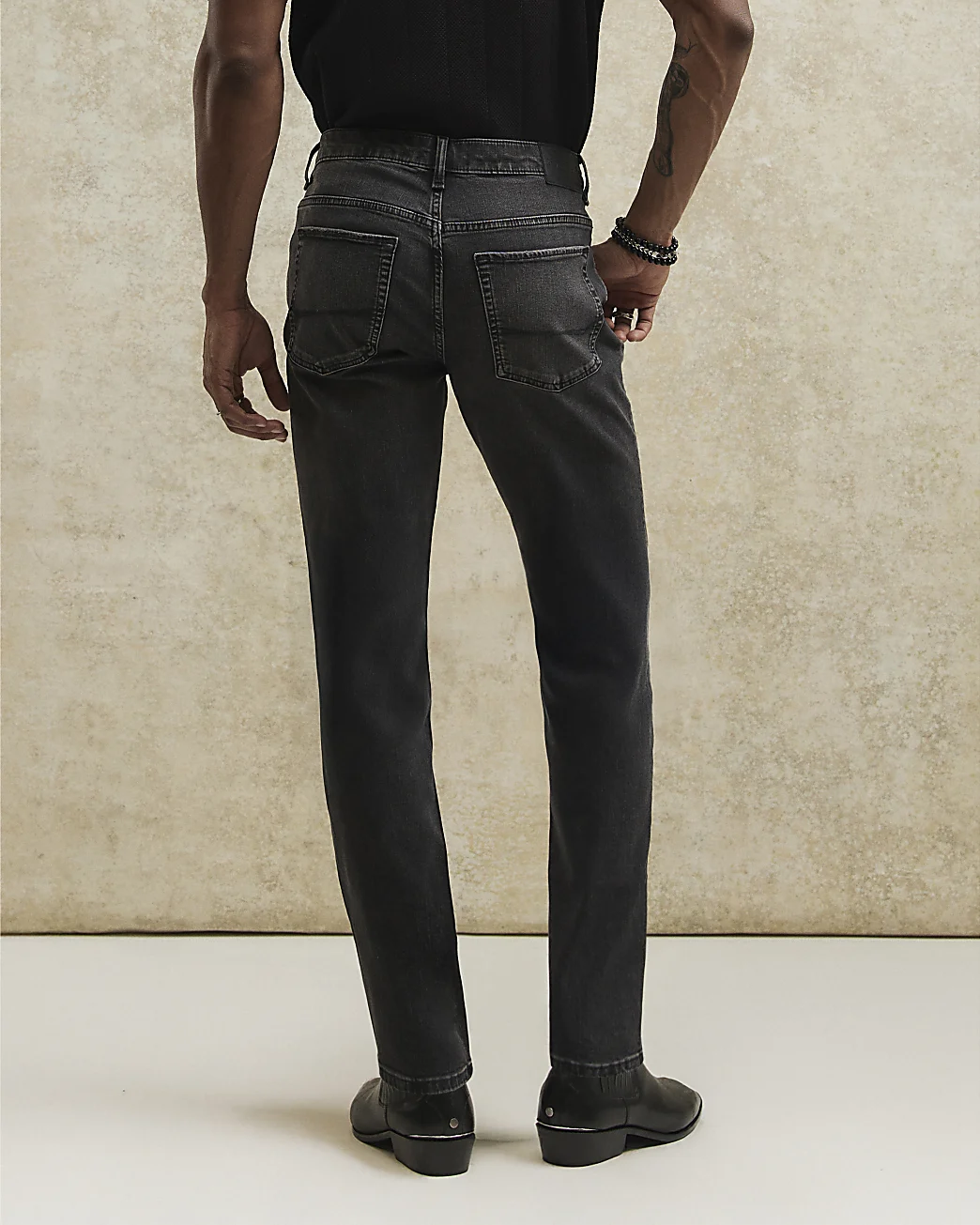 Designed by Linglocker, these black washed stretch jeans deliver a versatile, everyday essential with a refined slim fit and contemporary finish.