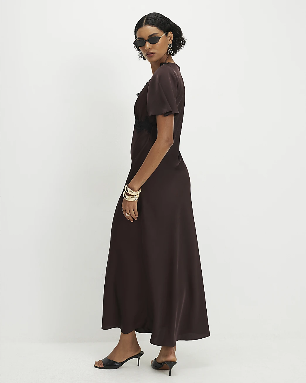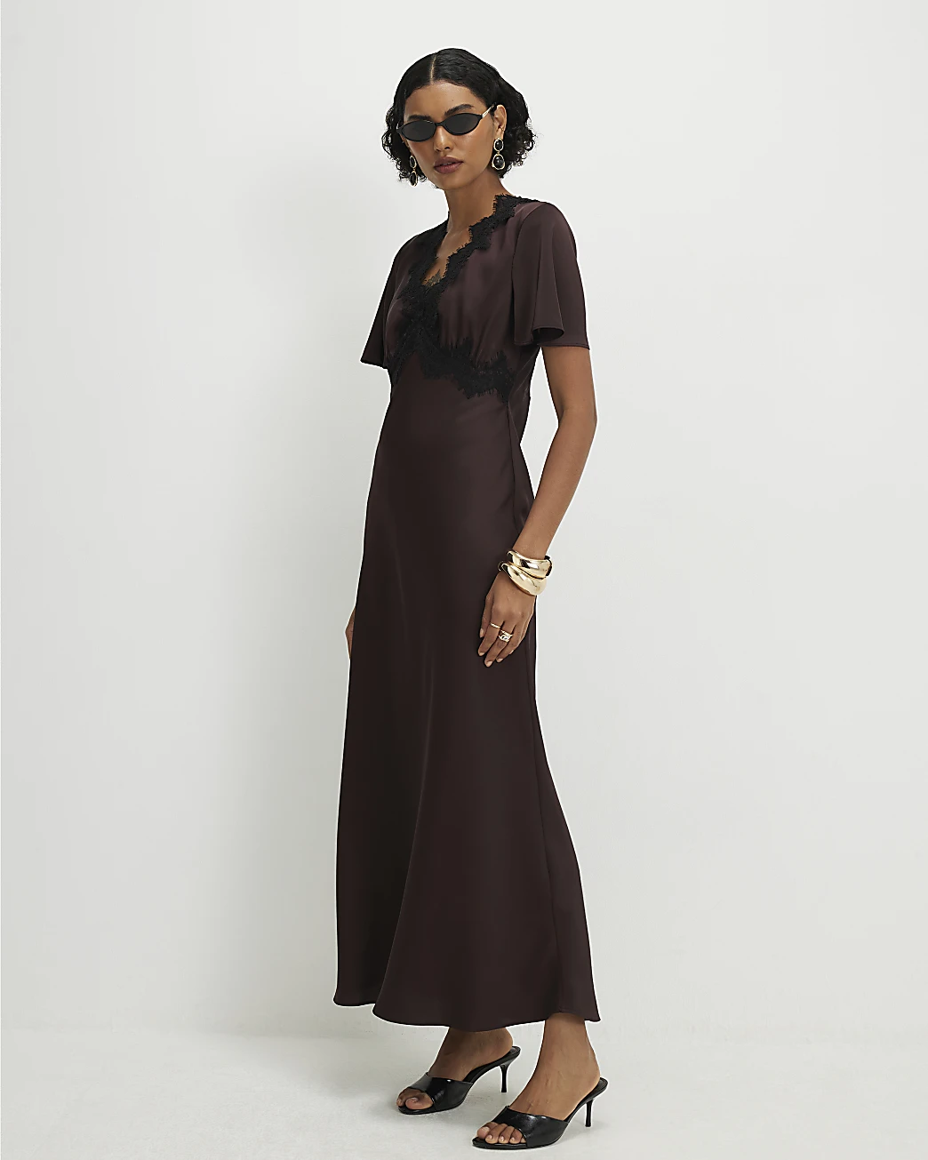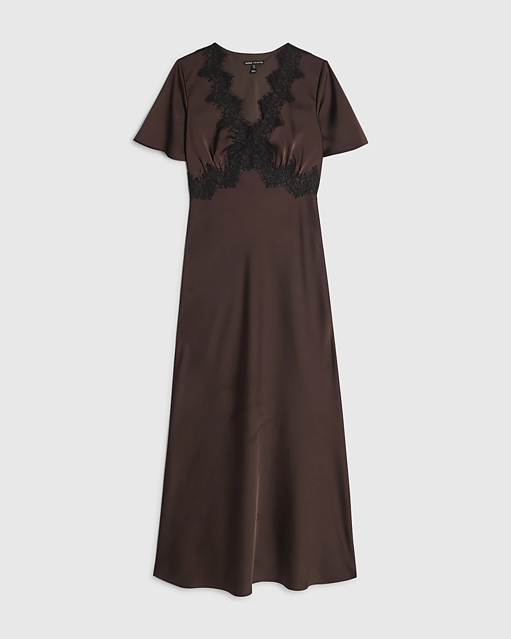 Linglocker Brown Lace Satin Short Sleeve Slip Maxi Dress