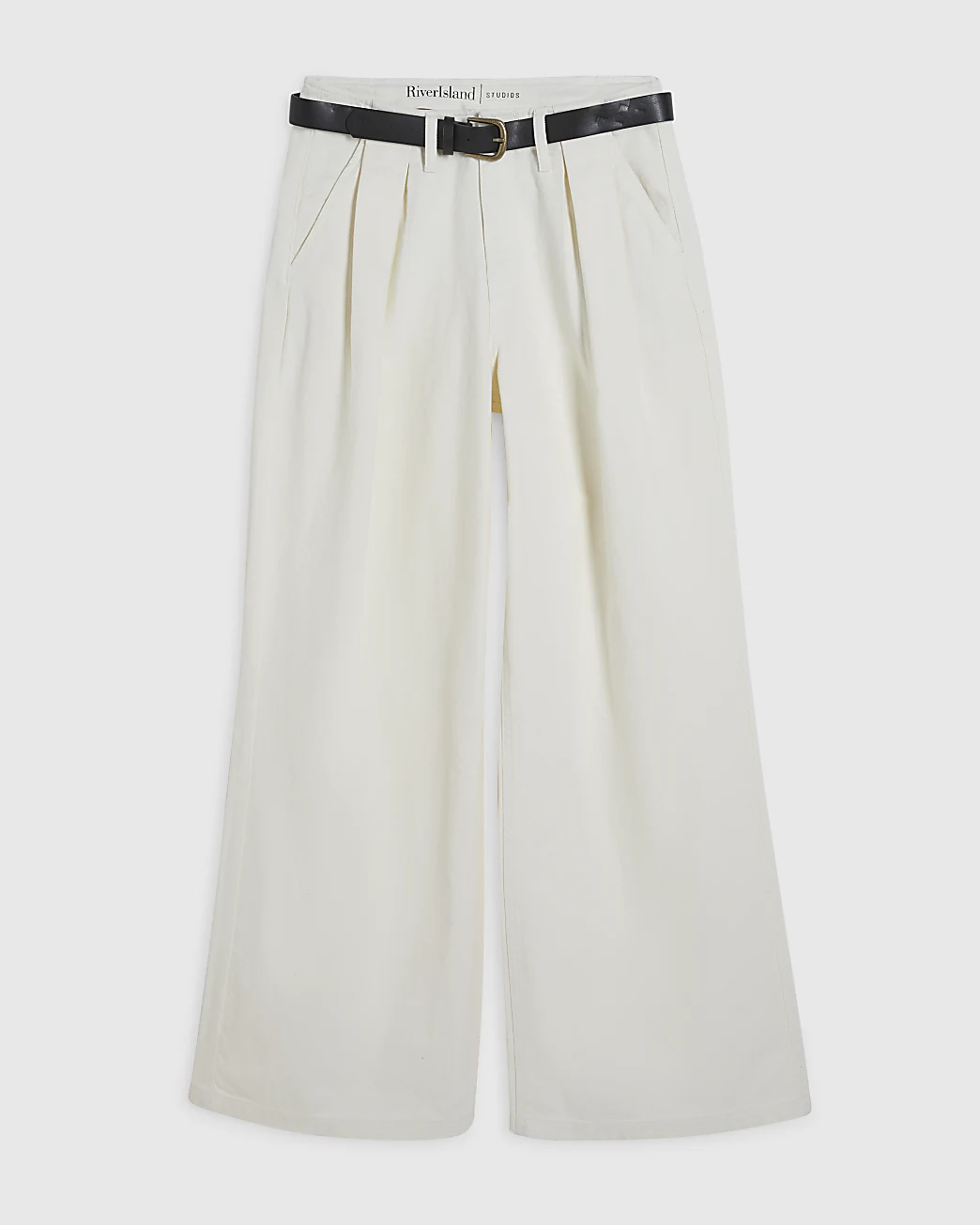 Linglocker Cream Belted Pleated Wide Leg Jeans
