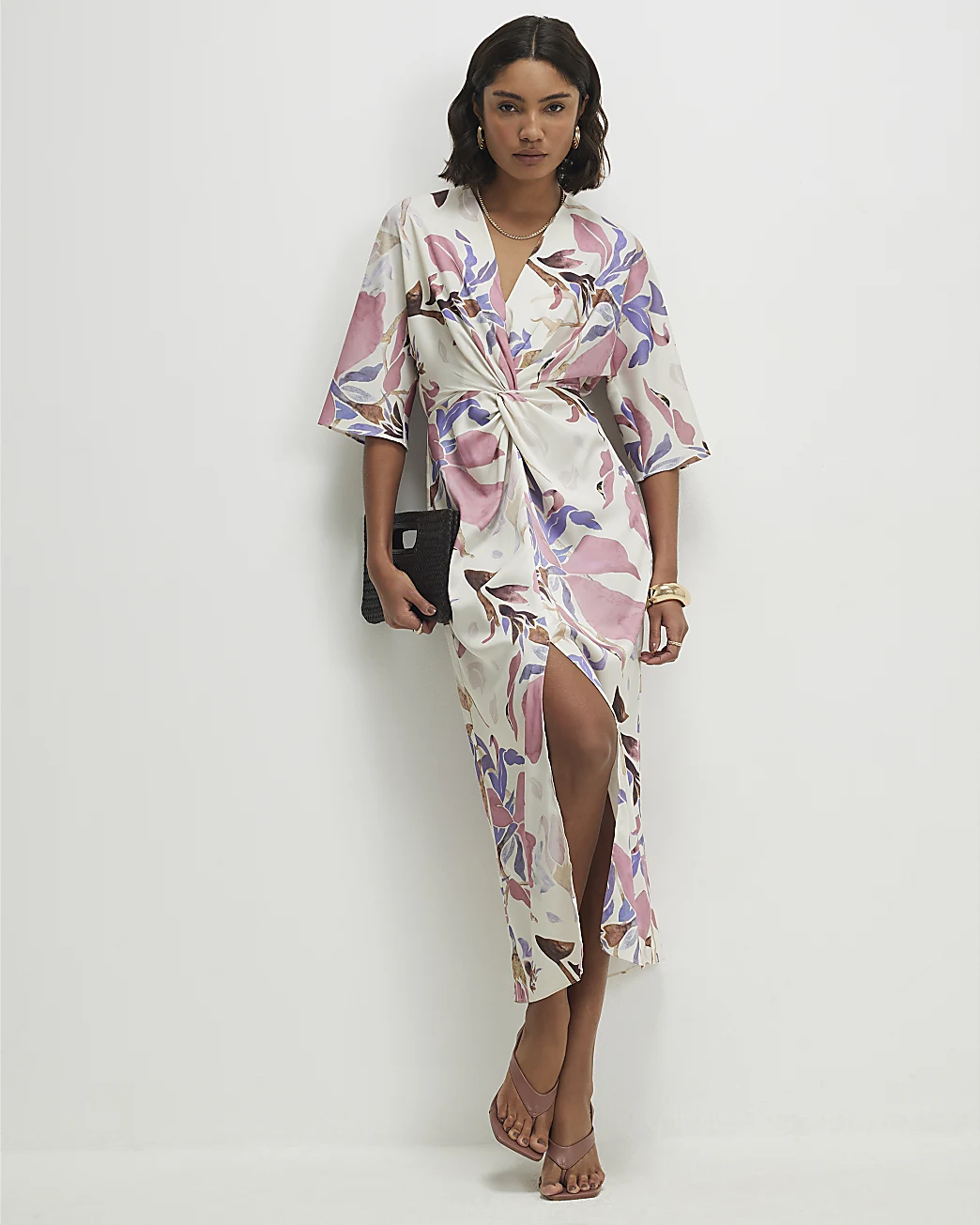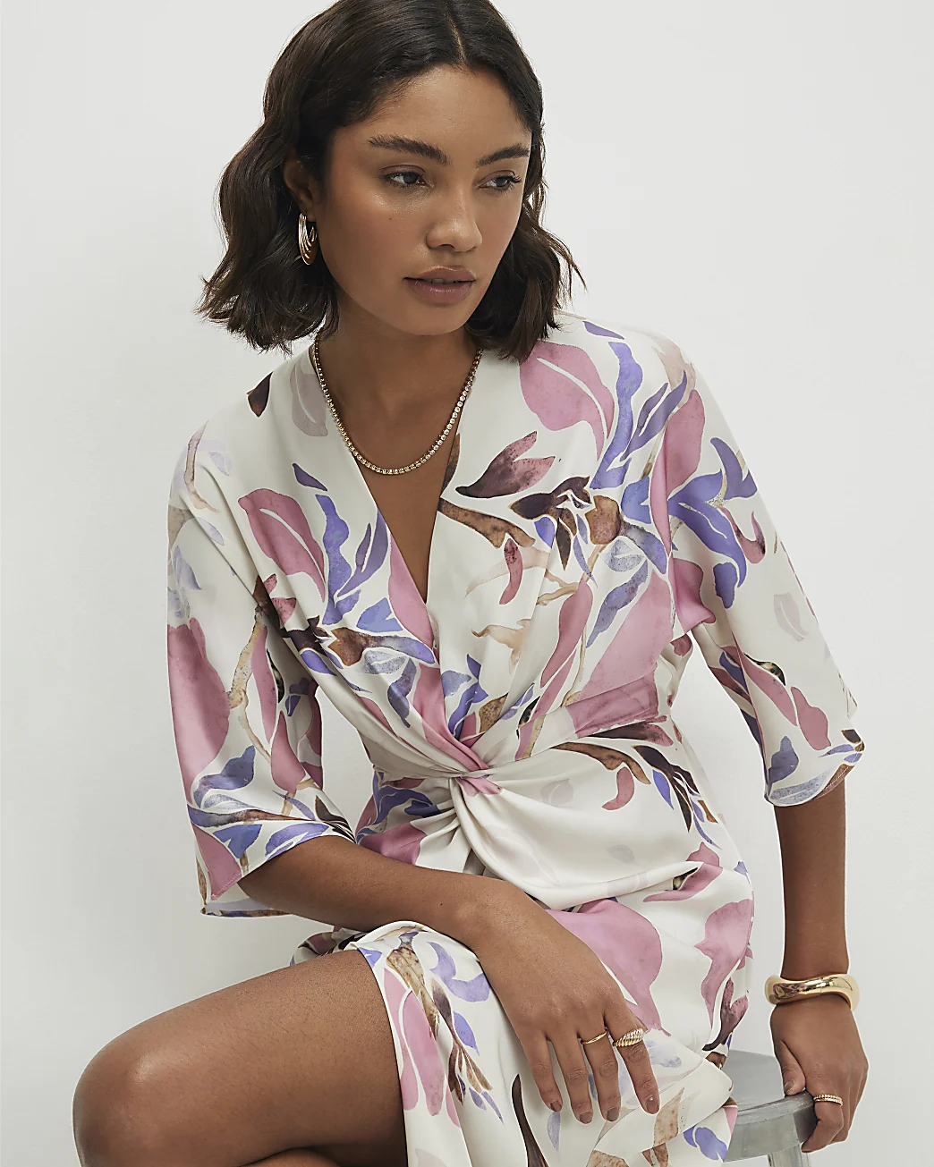 Elegant and effortlessly refined, this Linglocker midi dress is crafted in smooth satin fabric for a luxurious drape and subtle sheen. Designed with a flattering V-neckline and soft short sleeves, it offers a feminine silhouette that works beautifully for both daytime elegance and evening occasions. The delicate floral print enhances its romantic feel, while the chic twist detail at the front creates a sculpted, flattering shape. Finished with a graceful midi length, this piece is perfect for weddings, dinners, and special events.