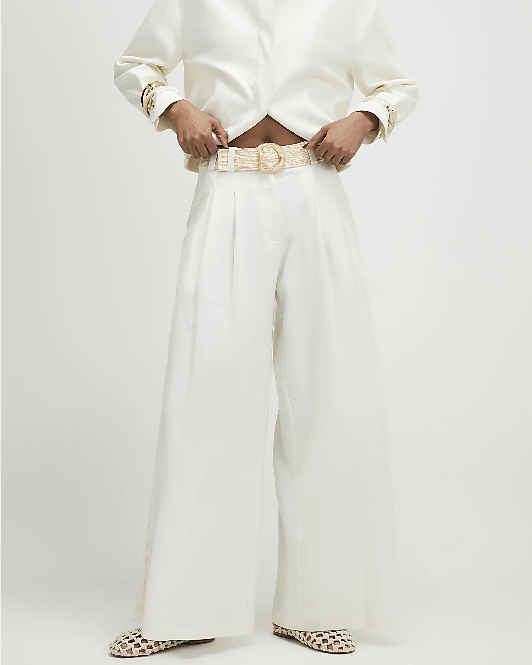 Linglocker White Belted Wide Leg Trousers