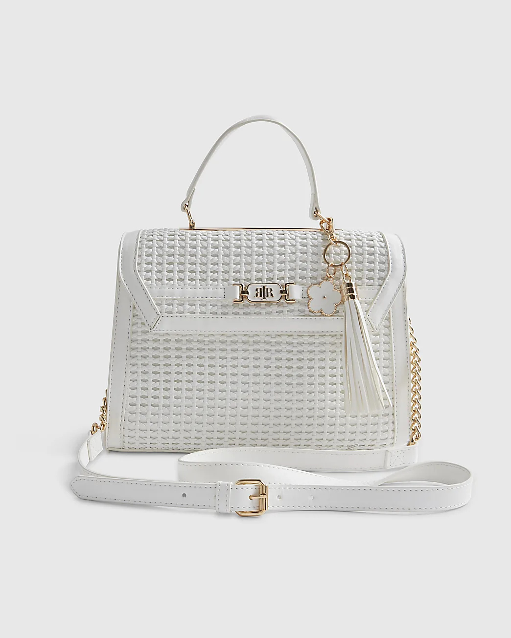 The Linglocker White Medium Woven Charm Tote Bag combines texture and elegance for an effortlessly chic everyday look. Designed with practical compartments and stylish accents, it is perfect for both casual and refined outfits.